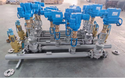 產(chǎn)品特點: 1、減溫減壓裝置主要包括:減壓系統(tǒng)(電/氣動減壓調(diào)節(jié)閥);減溫系統(tǒng)(主汽管體、電氣動給水調(diào)節(jié)閥、節(jié)流閥、止回閥、截止閥);安全保護(hù)系統(tǒng)組成; 2、采用減溫、減壓分體閥結(jié)構(gòu),使蒸汽先減壓;然后單獨減溫,分別在不同系統(tǒng)內(nèi)完成,該裝置的長度提高了運行的可靠性,便于壓力、溫度的獨立調(diào)節(jié); 3、減壓系統(tǒng):由減壓閥和節(jié)流孔板組成,減壓閥通過通過改變流通面積達(dá)到調(diào)節(jié)壓力的目的; 4、減溫系統(tǒng):通過高壓差調(diào)節(jié)閥,將冷卻水從噴嘴處以霧狀噴入蒸汽管道的蒸汽中,使蒸汽溫度降低; 5、主汽管體:有蒸汽管和混合管組成,根據(jù)用戶提供的參數(shù)決定,是減溫減壓裝置的主體設(shè)備,目的是將減溫減壓后的蒸汽送入用戶需要的管道上; 6、安全保護(hù)系統(tǒng):為防止二次蒸汽壓力超過規(guī)定的值,起到安全保護(hù)的作用,根據(jù)不同參數(shù)選用滿足工況要求的安全閥; 7、熱力控制系統(tǒng):通過接受出口溫度、壓力信號,經(jīng)過信息處理,實現(xiàn)自動調(diào)節(jié)。